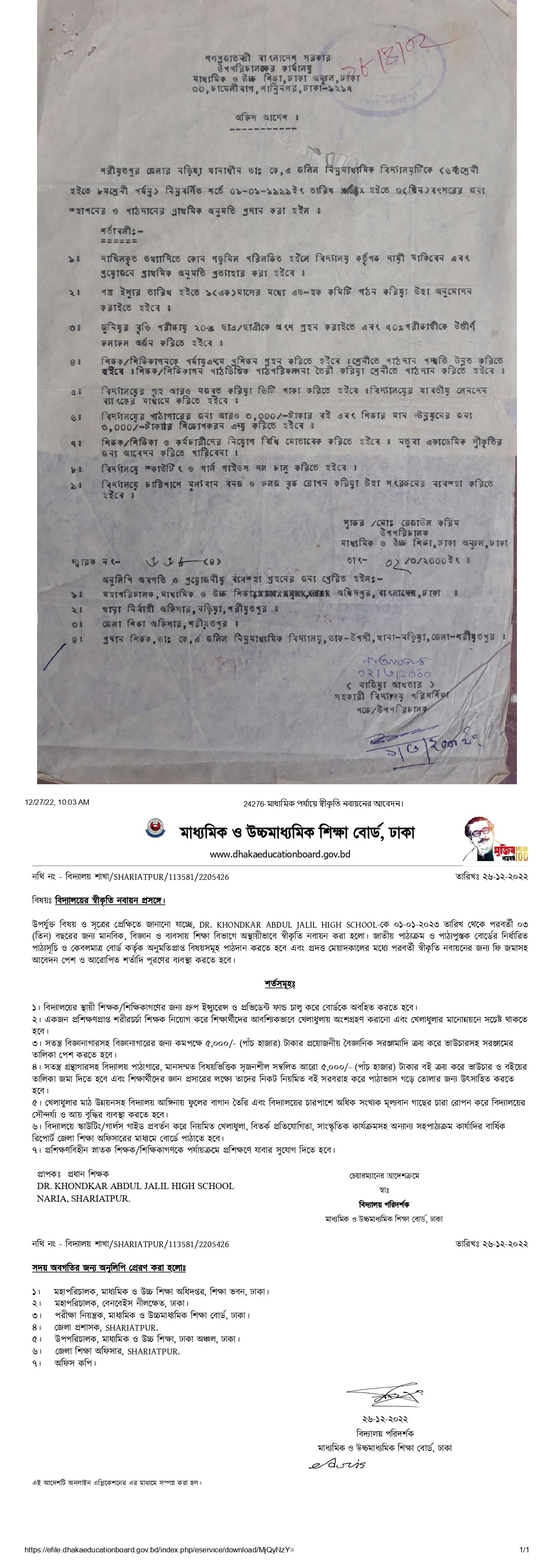 বিদ্যালয়ের এমপিও সংক্রান্ত তথ্য